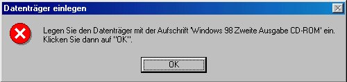 Der Computer benötigt jetzt noch die "Win98 - CD" um die Installation abzuschließen. Legen Sie die Cd in das Laufwerk ein und klicken Sie auf "OK"
