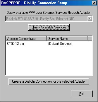 Mit einem Doppelklick auf die erste Datei ruft man einen Assistenten auf, der selbständig die benötigte DFUe-Netzwerkverbindung erstellt. Ein Fenster "RASPPPOE - Dial-Up Connection Setup" öffnet sich Nun muss die Auswahl der installierten Netzwerkkarte getroffen werden, gefolgt von einen Klick auf "Query Availibale Services".(Wenn Sie nur eine Netzwerkkarte eingebaut haben, können Sie auch keine weiteren auswählen) In der Spalte "Access Concentrator" erscheint ein Eintrag z.B. "STGX12-erx" (Der Name kann jedoch auch von der Anleitung abweichen!)